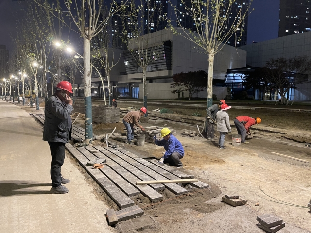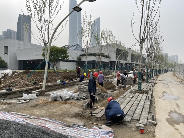 接到4月21日前完成(和園-南京濱江規(guī)劃建設(shè)展示中心段)景觀恢復(fù)的節(jié)點(diǎn)任務(wù)之后,市政公司立即調(diào)整施工計(jì)劃,增加物力支持,加大投入機(jī)械設(shè)備進(jìn)場量,確保高質(zhì)高效施工,穩(wěn)步推進(jìn)工期進(jìn)度。同時,組織施工隊(duì)伍連夜施工,逐一確定施工材料供貨節(jié)點(diǎn)。施工結(jié)束后當(dāng)天及時復(fù)盤,并按進(jìn)度調(diào)整次日工作計(jì)劃。