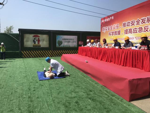 本次應(yīng)急救援演練由河西集團(tuán)新城公司承辦。模擬事故發(fā)生后,班組負(fù)責(zé)人向項目安全部匯報。項目經(jīng)理立即聯(lián)系附近雙閘街道衛(wèi)生院請求醫(yī)護(hù)救援,組織應(yīng)急救援工作,向監(jiān)理及甲方主要領(lǐng)導(dǎo)報告事故發(fā)生情況。隨后,有關(guān)人員及隊伍按照現(xiàn)場救援指揮部的指示及《高溫中暑應(yīng)急救援預(yù)案》的要求開展救援及善后工作。