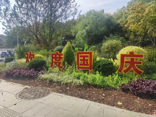 樂山路和夢都大街的東南角節(jié)點是新增加的花境景觀,使用了完美冬青、迷迭香、金葉蕕等二十多個草花品種,錯落有致的草花搭配和花境中豎起的“歡度國慶”標語牌,烘托出熱烈的節(jié)日氣氛。