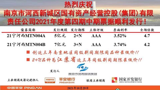 11月1日,集團(tuán)2021年度第四期永續(xù)中票順利發(fā)行,發(fā)行金額12億元,期限3+N年品種7億元,票面利率3.74%;期限2+N年品種5億元,票面利率3.52%,均取得南京市近三年同級別同品種最低價(jià)格!