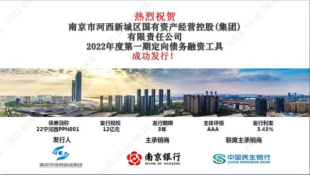 本次債項(xiàng)發(fā)行在主承銷商南京銀行,聯(lián)席承銷商中國民生銀行的共同努力下成功首發(fā)12億元(債券簡(jiǎn)稱:22寧河西PPN001)。