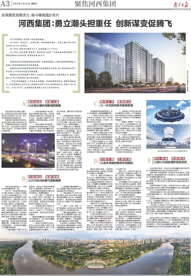 通過全面深化改革,企業(yè)的治理體系更加完善,治理能力顯著提升,發(fā)展活力不斷增強(qiáng)。今年7月,奧體公司競(jìng)得江北核心區(qū)G11地塊和河西南G31地塊,與高科置業(yè)合作開發(fā)仙林湖G38地塊,以全新姿態(tài)深耕河西,布局江北、仙林。江尚紫薇、云尚紫薇首開區(qū)已達(dá)銷售形象進(jìn)度,預(yù)計(jì)10月上市銷售,丹若園也將于近期公開樣板區(qū)。新城公司僅2022年,就承擔(dān)工程代建項(xiàng)目39個(gè),其中市級(jí)重大項(xiàng)目5個(gè)。工程建設(shè)高效推進(jìn),其中南京憲法廣場(chǎng)項(xiàng)目提前7天完成主體結(jié)構(gòu)封頂,華泰證券研發(fā)及培訓(xùn)中心項(xiàng)目也提前順利開工。會(huì)展公司“云上會(huì)展”優(yōu)勢(shì)凸顯,2020年,世界智能制造大會(huì)云上展館參展商3312家,訪問量近250萬(wàn)人;2021年,世界制造大會(huì)云上參展商4471家,訪問量達(dá)342萬(wàn)人。公園公司深耕河西濱江8大公園,打造了南京眼旅游區(qū)、荷蘭友誼園、魚嘴燈塔落日、消防主題公園等一批網(wǎng)紅打卡點(diǎn),客流量提升近40%。商管公司以中和村四期項(xiàng)目為依托,打造“商業(yè)街區(qū)+長(zhǎng)租公寓”聯(lián)營(yíng)產(chǎn)品,成功推出“和里·和你商業(yè)街區(qū)”“紫金·和寓”“河西·云座”三大品牌產(chǎn)品。園林公司、公園公司以被市總工會(huì)命名的“趙康兵職工創(chuàng)新工作室”為紐帶,在科研項(xiàng)目、課題實(shí)施、成果推廣等方面融合互動(dòng),獲得國(guó)家授權(quán)專利8項(xiàng)。由河西置業(yè)公司開發(fā)建設(shè)、新城公司代建的南京金融城三期項(xiàng)目,招商、建設(shè)同步進(jìn)行,助力東部重要金融中心建設(shè)跑出“加速度”。青奧城公司扎實(shí)開展對(duì)標(biāo)提升工作,全力推動(dòng)酒店板塊高質(zhì)量發(fā)展,3年來利潤(rùn)增長(zhǎng)超兩倍。奧體物業(yè)位列2020年江蘇省物業(yè)服務(wù)綜合實(shí)力50強(qiáng),榮獲2021年南京影響力物業(yè)品牌、2021年南京暖心物業(yè)品牌等稱號(hào)?!?年來,河西集團(tuán)秉持“深耕河西 立足南京 面向全國(guó)”的發(fā)展戰(zhàn)略,積極走出去拓展市場(chǎng):奧體公司成功建設(shè)集團(tuán)首個(gè)異地開發(fā)項(xiàng)目——無錫紫蘭園;新城公司承接安徽眾彩物流園等監(jiān)理項(xiàng)目7個(gè);青奧城公司先后與30家酒店建立合作關(guān)系,業(yè)務(wù)范圍遍及6個(gè)省市;園林公司12個(gè)在建項(xiàng)目分布在安徽、湖北、河南等7個(gè)省市……