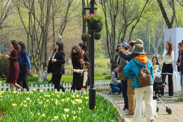 春意盎然,花海繽紛,各色郁金香隨風(fēng)搖曳,吸引眾多市民游客駐足拍照、記錄春景。如今,綠博園郁金香已經(jīng)成為南京春日賞花的一張“金色名片”,春花與游人,共同繪就成一幅和諧優(yōu)美的畫卷。